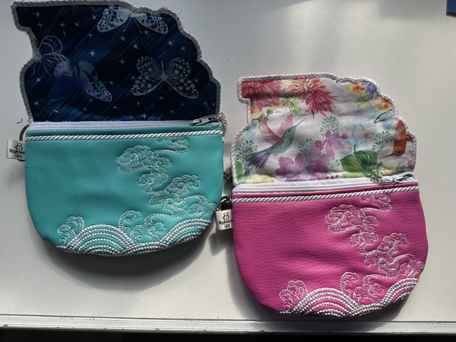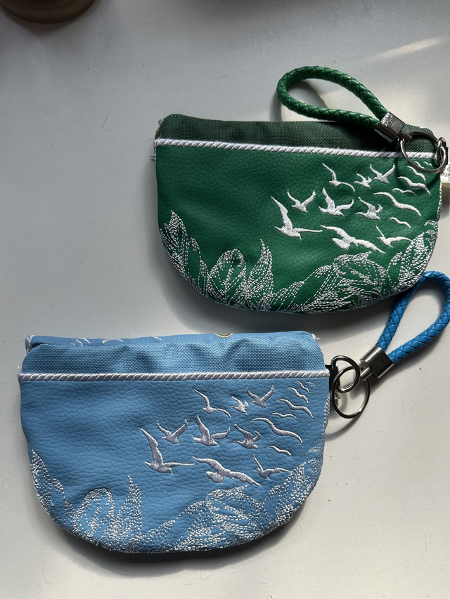 bag has a zipped main pocket and a decorated slip pocket on the back. It is fully lined in bright coloured fabric. The large is supplied with a crossbody strap, whilst the small has a wristlet, unless otherwise requested. Available in a choice of colours - provide details at checkout or via email.