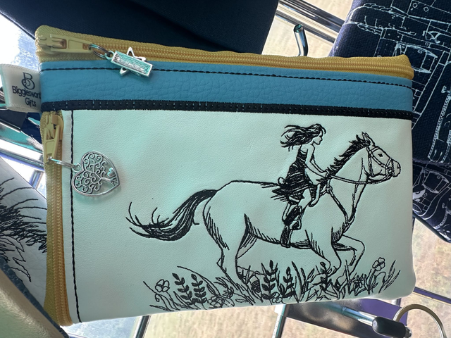 Fully lined, onezip along the top full size pocket, and a side zip with a pocket from the line of embroidery down. Size 5x7" approx